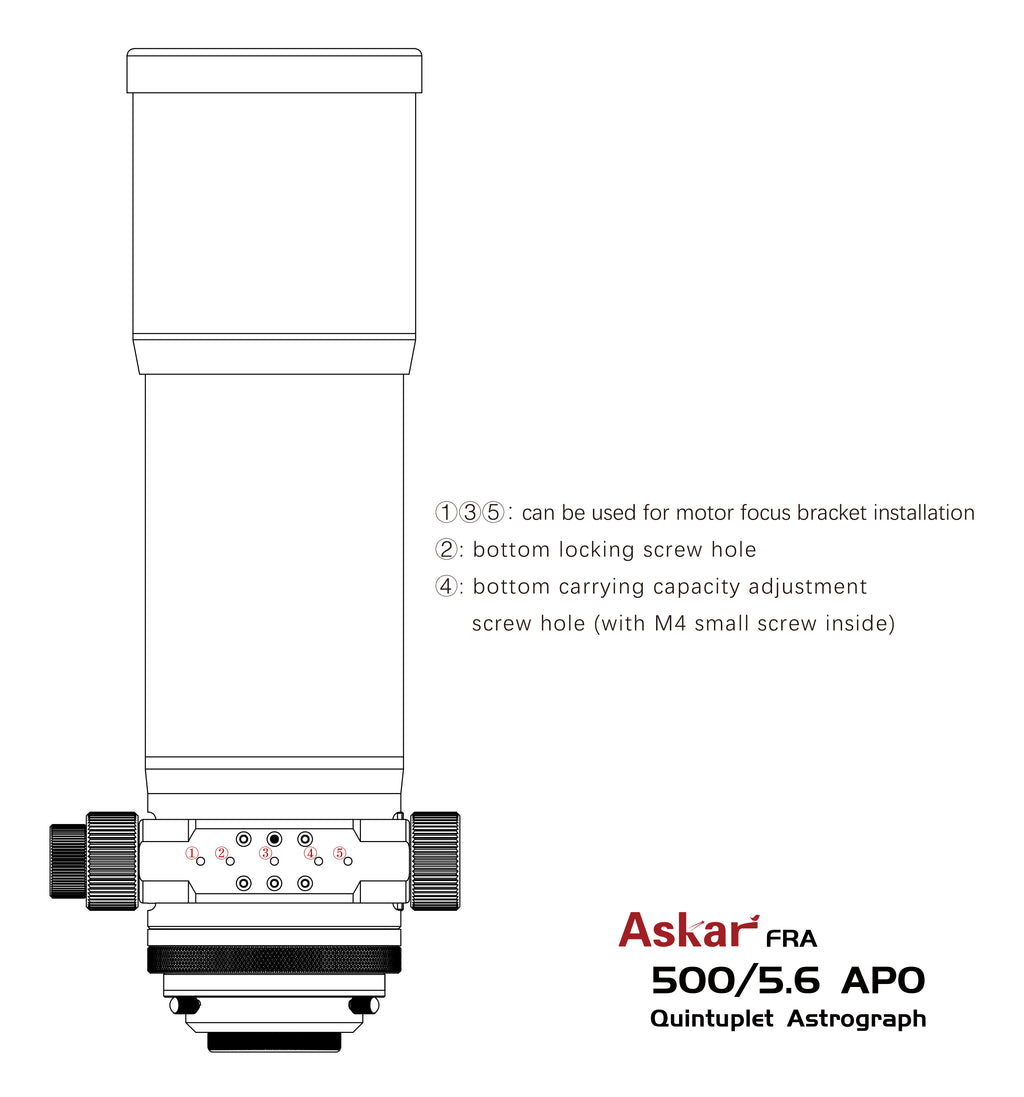 The astrograph wears smooth coating and is evenly finished. The graduation inside of the focuser is quite clear and easily readable. The focuser is tough and solid, and on the left side of it, there is a standard finder base with a silver thumb screw. So the FRA500 can piggyback carry finders, guiders or other potential astronomy accessories.
