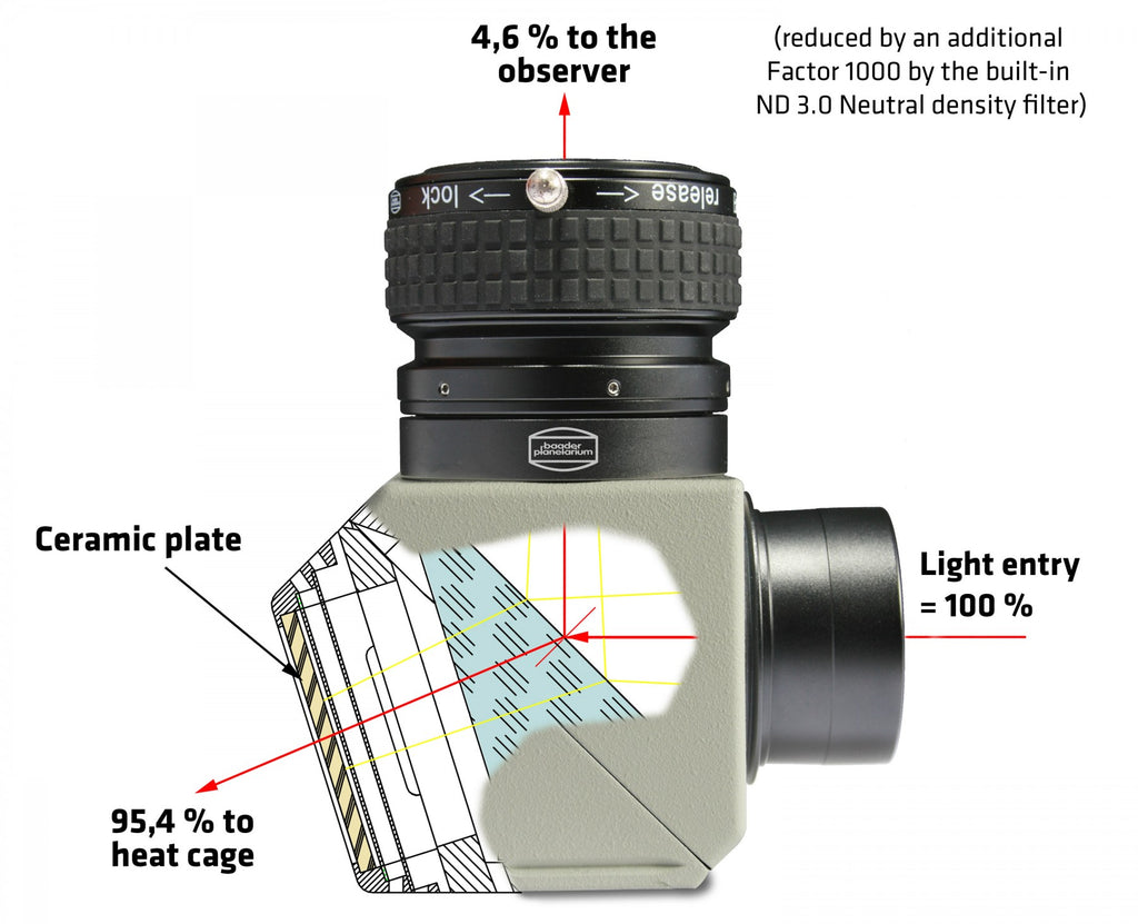 Every Solar Diagonal needs additional neutral density filters since the reflected energy of the first surface prism (4.6%) still is a factor of 1000 too large for the human eye. All Baader Solar Diagonals are delivered with a pre-mounted ND 3.0 Baader precision 2 light reduction filter. The photographic version includes other ND-Filters to achieve shorter exposure times. Use with care!