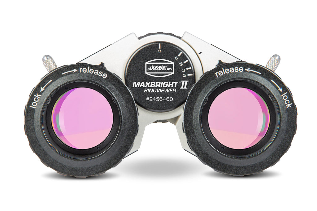 - All optical surfaces of the Maxbright® II feature a 7-layer multi-coating. The prism chairs (mounts) of the prisms are constructed like those of the Mark V Großfeld (Giant)-Binocular. The clear aperture is 26 mm on the telescope side and 25,5mm on the eyepiece side – even our 35 mm eudiascopic eyepieces are illuminated without vignetting. In comparison to models with smaller prisms you can see a much larger part of the sky at the same magnification – similar to our Mark V Großfeld (Giant)-Binocular.
