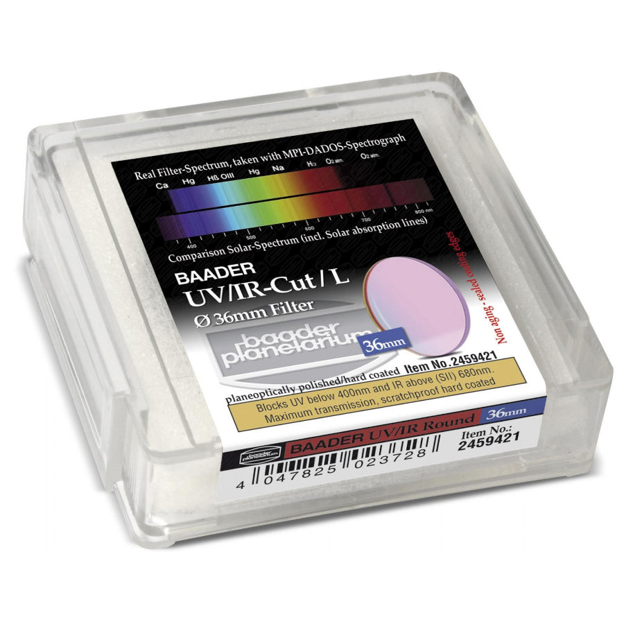The Baader UV-IR Cut/L Filter is a must for all digital imaging with DSLR cameras, CCD cameras, and modified webcams. It removes the unwanted UV and IR wavelengths from your images by blocking UV below 400 nm and IR above 680 nm. This UV-IR Cut filter is 36mm unmounted