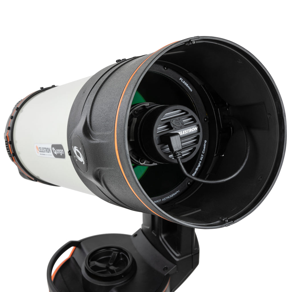 At the heart of Celestron Origin lies the patented Rowe-Ackermann Schmidt Astrograph (RASA)—a landmark advancement in optics. In the RASA design, the imaging sensor lies at the front of the telescope tube, not the back, creating an ultra-fast f/2.2 system with an extraordinarily wide field of view while providing sharp images to the edge. Since it launched in 2014, RASA technology has become the go-to choice for space surveillance and satellite tracking. National defense contractors, professional research astronomers, and governments trust RASA to detect tiny pieces of debris and space junk, keeping our vital communications satellites safe in orbit. For Origin, Celestron’s optical engineers developed a brand-new 6” RASA with all the same capabilities of an observatory-grade instrument in a grab-and-go package.