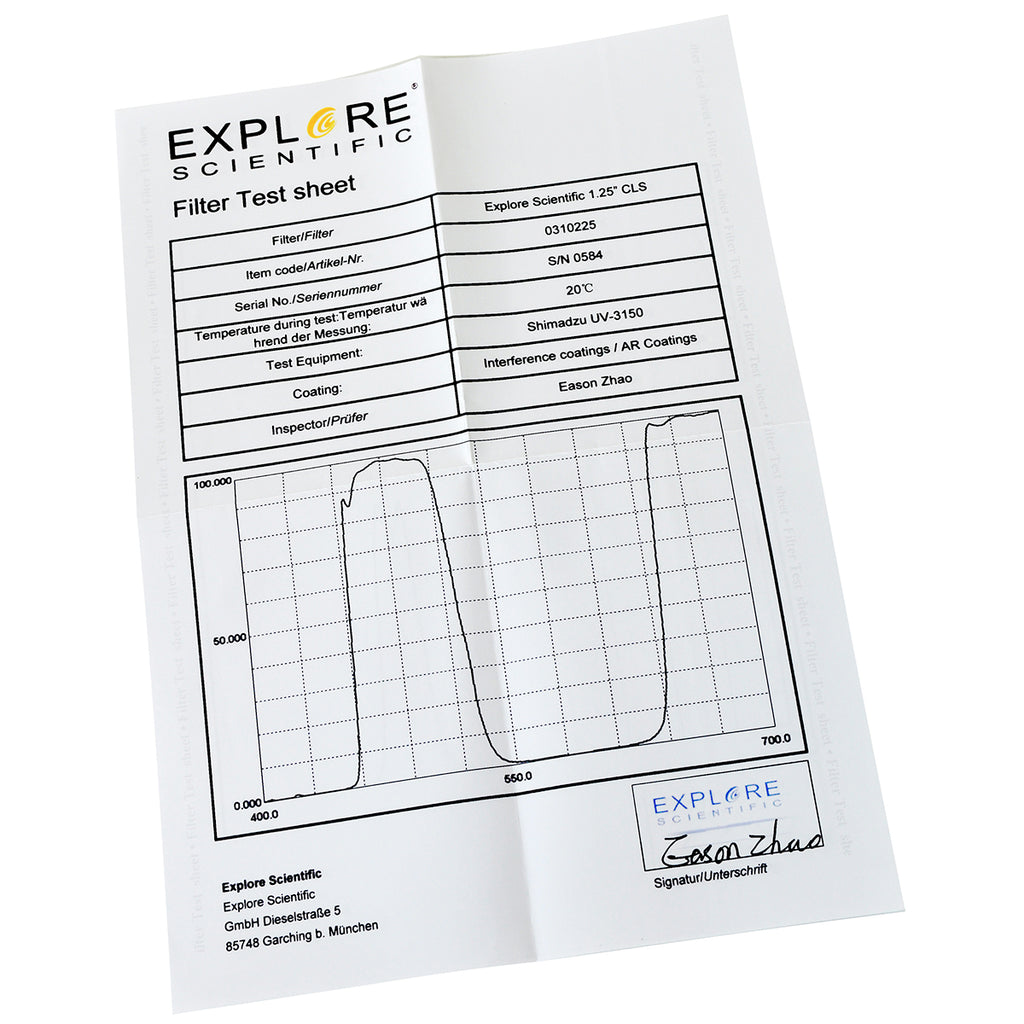 The Explore Scientific nebula filters come with a individual test certificate - your guarantee to receive a premium filter.