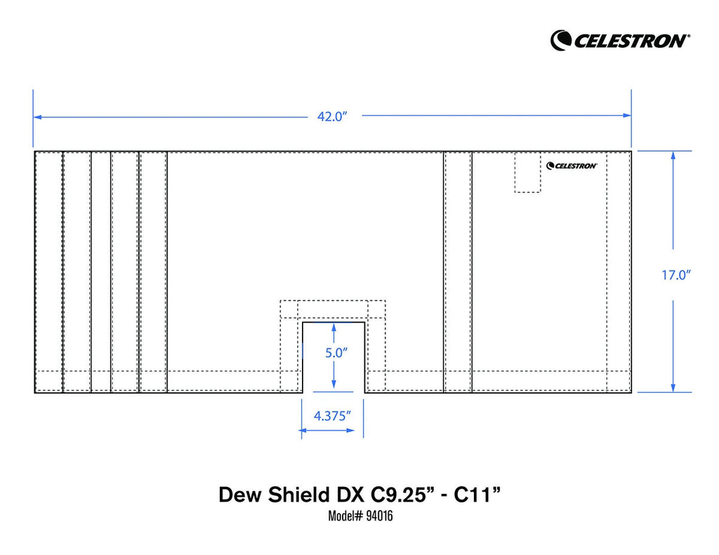 The Dew Shield DX provides a perfect, custom fit designed specifically for 9.25” and 11” Celestron optical tubes. The Dew Shield is built from durable PE plastic that is flexible but strong. Extra padding has been added at the tube attachment edge to create a stronger fit on the optical tube. The felt-lined interior absorbs any additional stray light and excessive moisture, creating optimal contrast when viewing and imaging. The large dovetail cutout has been made both wider- to accommodate a 4” wide dovetail rails, as well as deeper, to create a more solid connection with the optical tube.