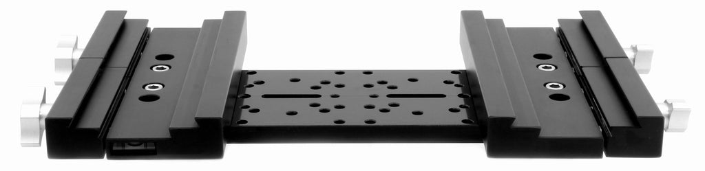 Side by side plate. Incorporates two saddle plates mounted parallel to each other. Used for mounting two optical systems side by side, by rotating the G-11 saddle 90 degrees. Accepts D and V series dovetail plates. Dual Clamp Design. Total thickness 1.5", Saddle plate separation 10.0", center to center.