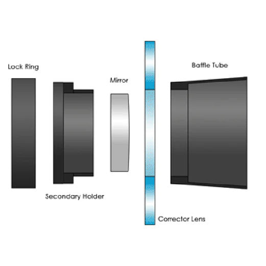 To install, the original assembly must be removed from the telescope. The corrector plate is removed first. Then the baffle tube is unthreaded to allow the secondary holder to be removed. The secondary mirror itself is then removed and placed into the new holder. This assembly is then put back onto the corrector plate and reinstalled into the telescope.