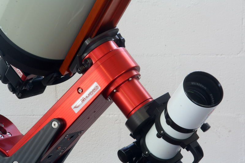 To allow the use of refractors with a length exceeding approximately 500 mm, an optional accessory has been realized allowing to distance the telescope from the mounting flange in order to allow the passage over the RA axis. It is also available a special kit that, in addition to distancing the telescope from the mount, allows the housing of a small guide scope obtaining also a better telescope balancing. With this configuration, it could be necessary to perform the telescope inversion at the meridian passage in the case of the telescope striking the tripod.