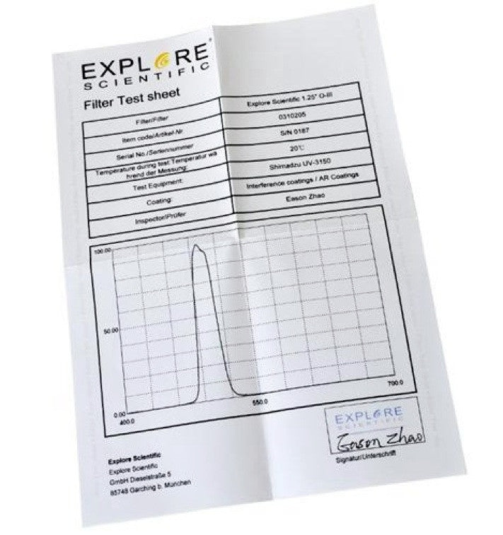 Explore Scientific 2" Oxygen-III Nebula Filter. Range from 483nm to 511nm with peak at 496nm. Peak transmission 96.7%.
