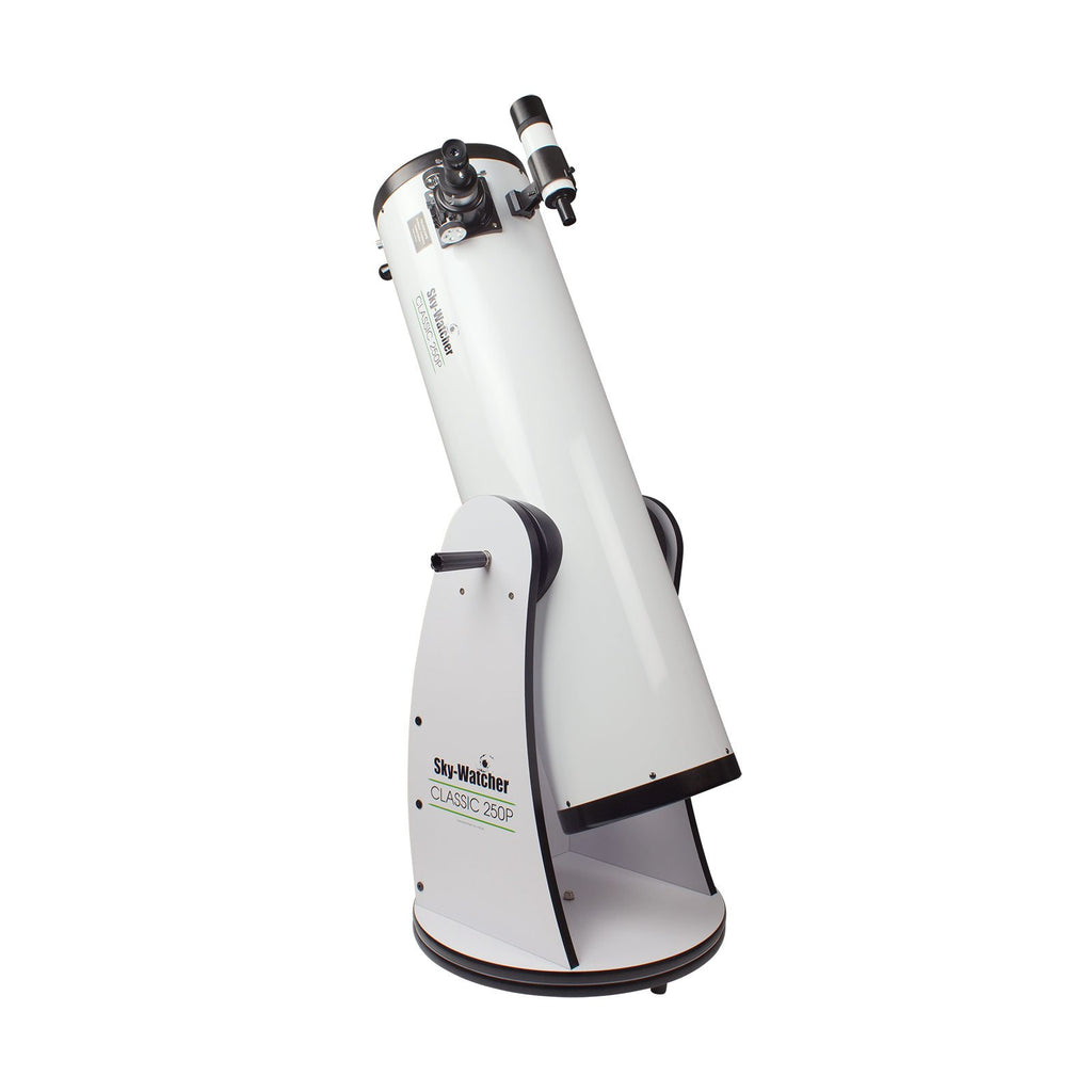 The Sky-Watcher Classic Dobsonian Telescope 254mm/1200mm (10") has a "paraboloidal" primary mirror to eliminate spherical aberration and a four-arm, secondary- mirror bracket with fine supports (0.5mm thick), to reduce diffraction spikes and light loss. In addition, this model include a 2" focuser with a 1.25" adapter, allowing the use of either eyepiece size. This model also include the new feature-tension control handle.