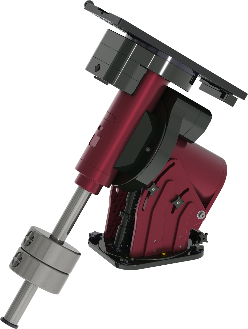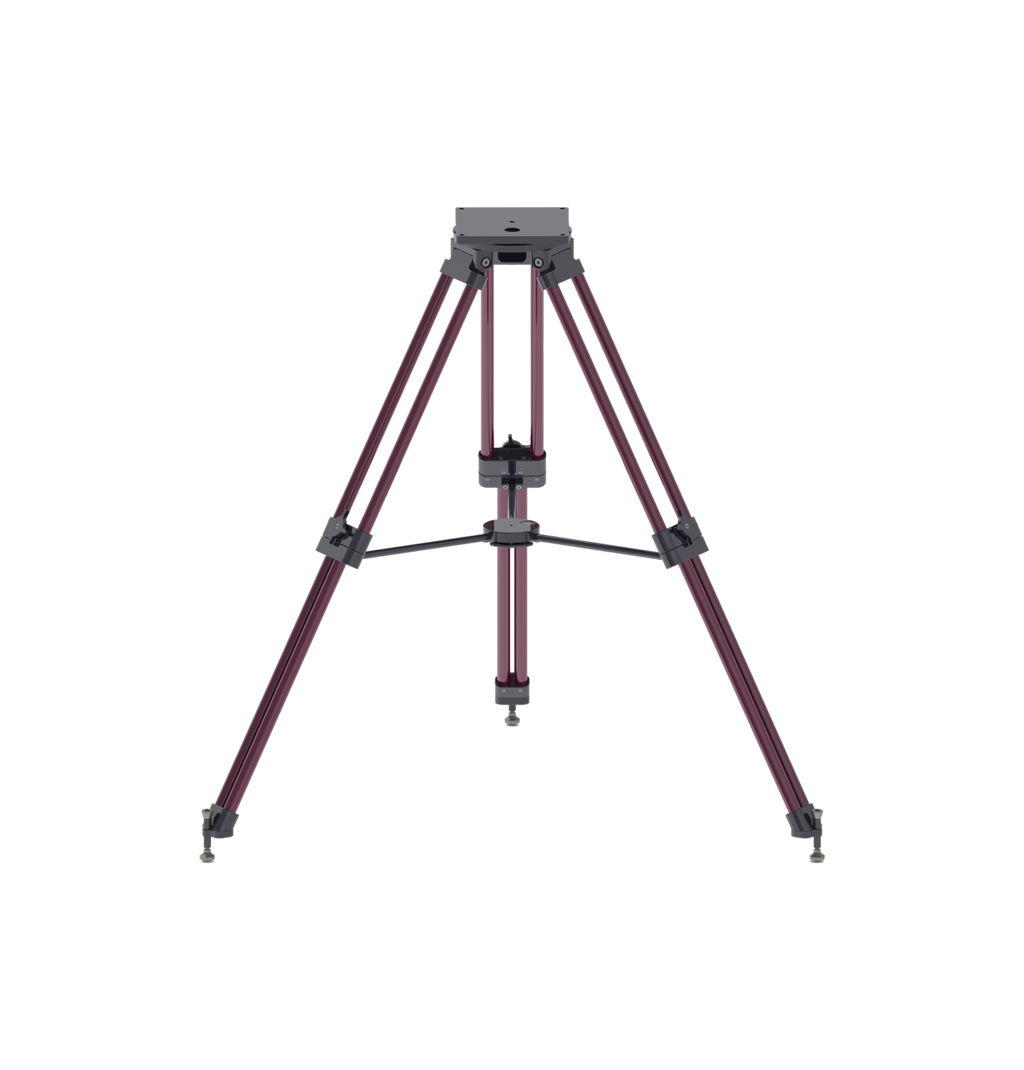 - The 6061 aluminum tripod legs are red anodized with black anodized aluminum structural components (top plate, feet, etc.).