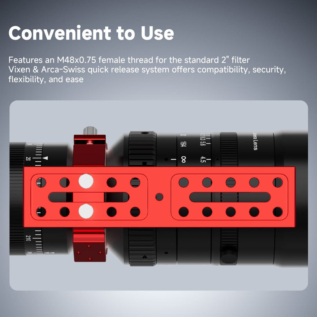 SV555 astro APO telescope camera lens features an M48x0.75 filter thread to install the 2" filter; additionally; the V-style & Arca-Swiss quick-release system is compatible; flexible and easy to use; enhancing the efficiency.