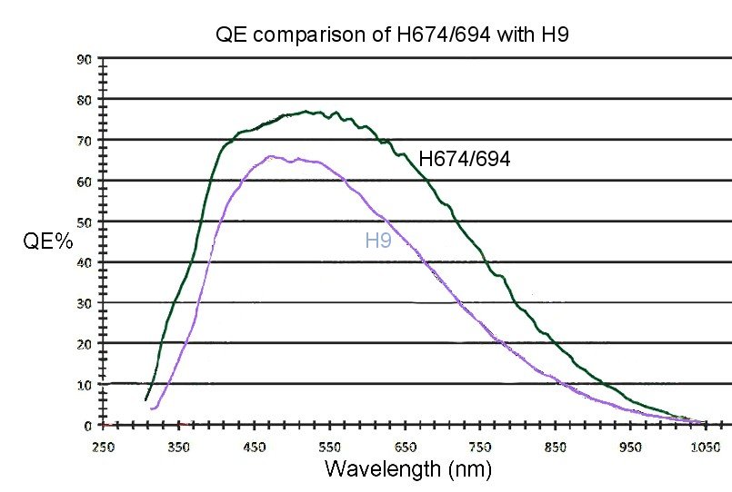 - Excellent QE of 77% peak in yellow light, 65% at Hydrogen alpha (656 nm).