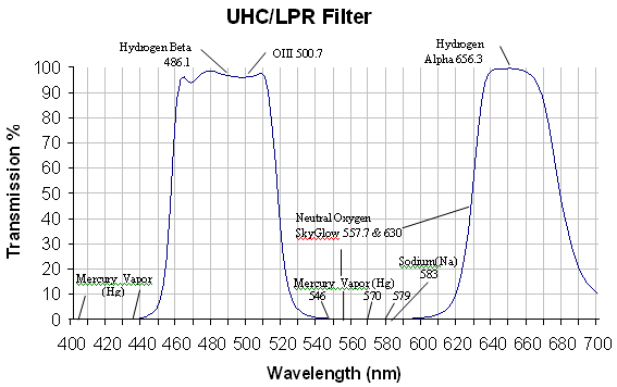 The high transmission, sharp cutoffs, and more moderate 60nm passband of the UHC/LPR filter retains a more natural view, yet significantly boosts overall contrast. Imagers will appreciate the broader bandpass and inclusion of an extremely efficient H-Alpha passband (656nm).