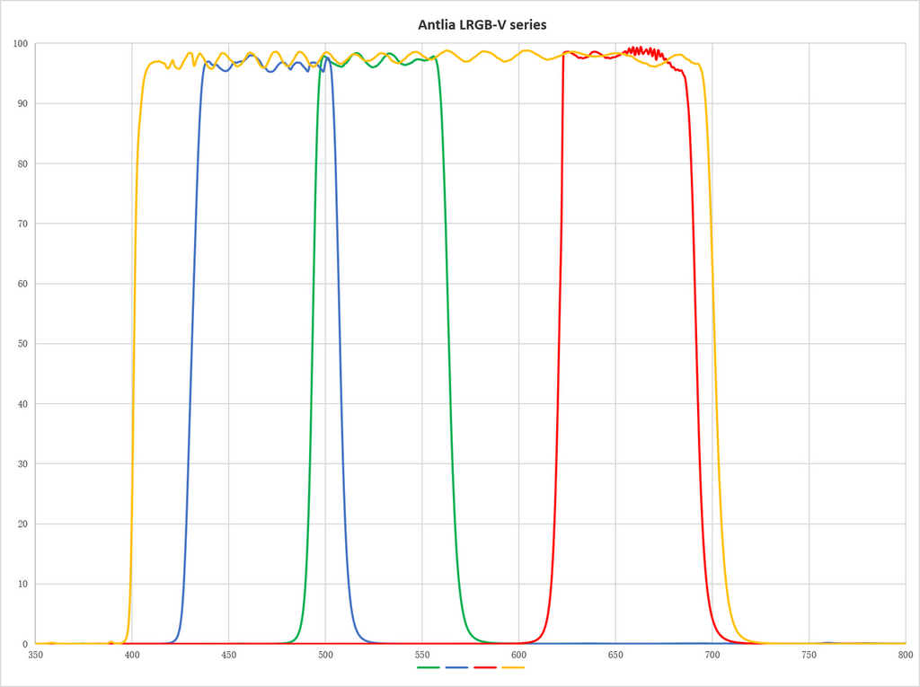The LRGB filter set is designed for maximum contrast and with extremely high gradients for clear differentiation of colors. The LRGB filter set divides the spectrum into its components red, green, blue and luminance. OIII emission overlaps on blue and green filters with maximum transmission to allow high efficiency and natural color imaging. Gap between green and red filters serves to block out the primary Sodium light pollution line at 589nm and improves color balance and separation.