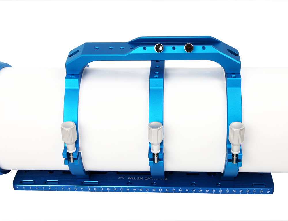 As with other William Optics refractors, the fit and finish on the FluoroStar 156 is superb. The telescope comes with cradle style mounting with three rings for extra stability, a saddle handle bar, and a universal Losmandy-style dovetail plate. All four pieces are anodized in blue. The included camera rotator and the Rotolock 2" Adapter are anodized to match. This is one beautiful telescope. By the way, the top of the handle bar has a Vixen-style saddle built in to accept William Optics slide base guide rings for a guide scope or finder. You can also use an accessory mounted on a Vixen dovetail.